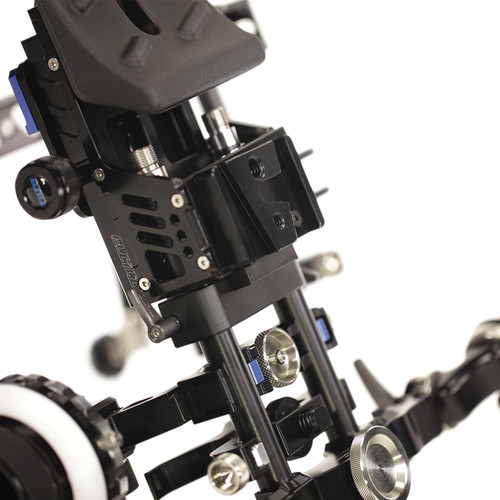 The front mounted 15mm LWS rod clamps are vertically adjustable, which allows you to adjust the rod to lens height for aligning matte boxes and other rod-mounted accessories to cameras with non-standard lens mount heights. On the back of the dovetail plate is an under-slung cold shoe mount and a second 15mm rod clamp, with up to an inch of vertical adjustment, for adding available rods and rod accessories. The rod clamp levers are all "kipping" levers, which means they are spring loaded so you can reset them to fully open or lock them even if you can't rotate the lever fully because of interference by other gear.