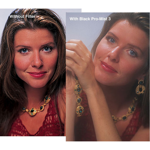 he Tiffen 82mm Black Pro-Mist 1/4 Filter helps to reduce the value of the highlights while slightly lowering the overall contrast. This filter is especially useful for smoothing out and softening facial wrinkles and other blemishes. While designed for use with movies, this filter can also be used for fashion and beauty applications.
