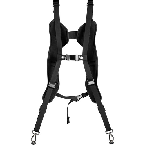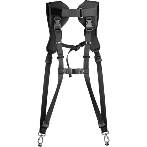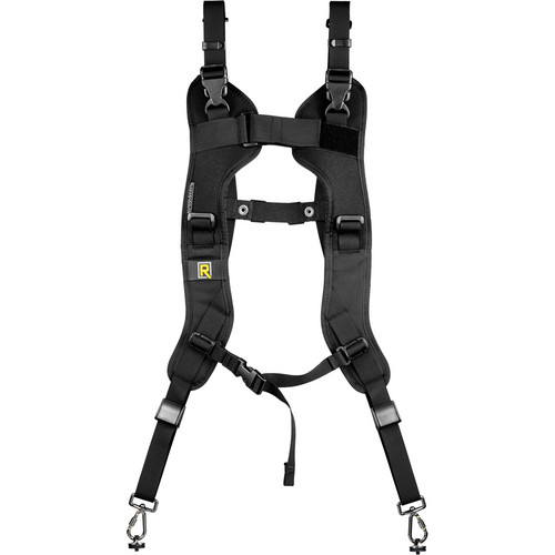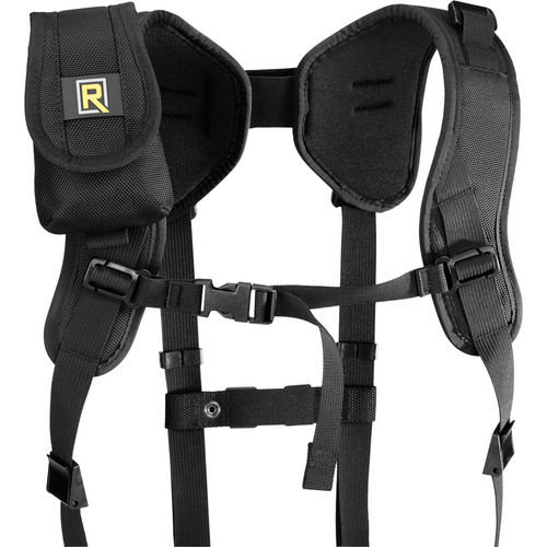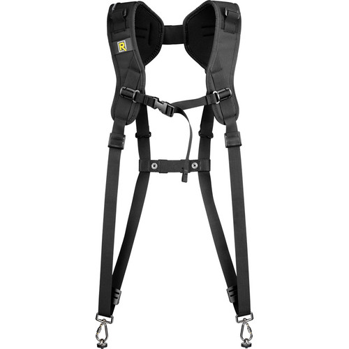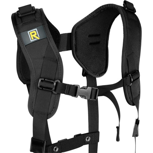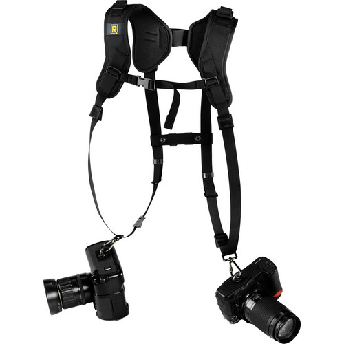 The BlackRapid RS DR-1 Double Strap is worn around the shoulders and is adjustable to fit most photographers. It will carry 2 cameras or lenses vertically at the side.