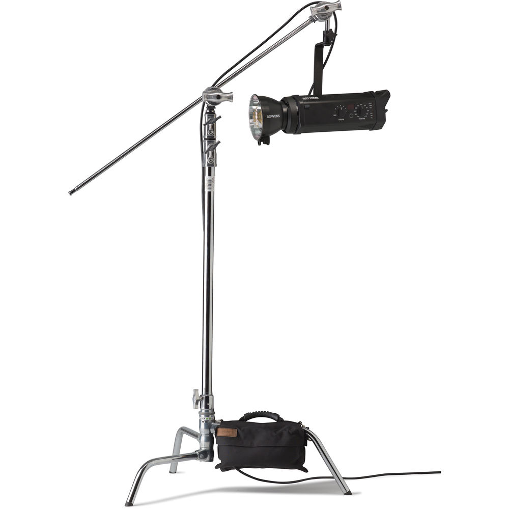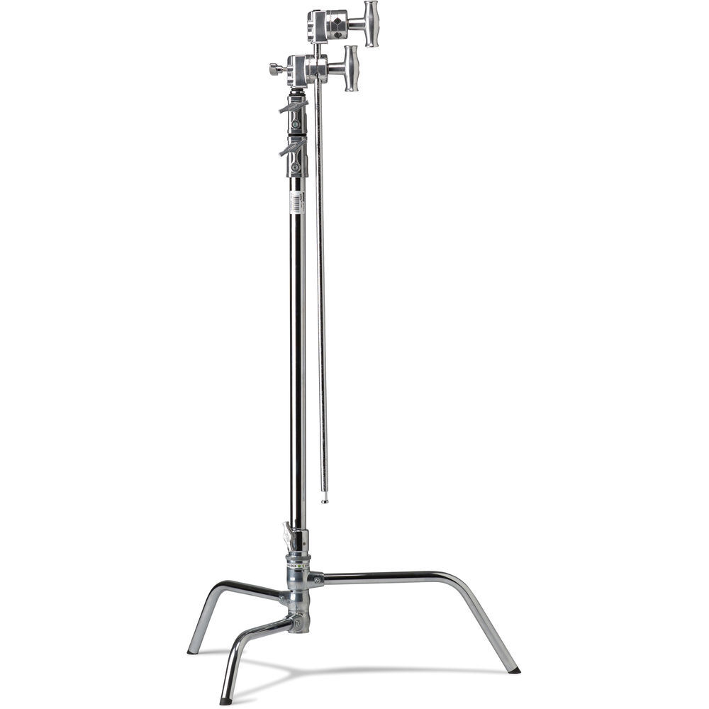 The C-Stand is a steel support with two risers and three sections that fully extend to a height of 9.7'. One great feature is the "turtle" base that detaches completely from the riser, allowing you to mount a light to it. The base has the classic wide, stable "C"-type legs that accommodate easy sandbagging and straddling of obstacles, folding flat for easy transport and storage. The detached riser can be used like a "trombone" or telescoping arm with the addition of the appropriate clamp or accessory. This 40" C-Stand features a 5/8" Baby Stud and patented ring-locking system that enables fast setup and breakdown.