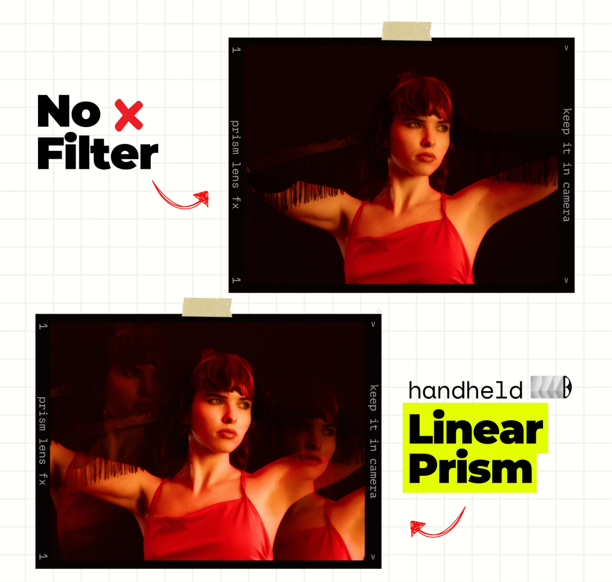 The Handheld Linear Prism is designed with a 3 faceted prism that creates subtle replications of your subject! This works great when you want to add an abtract duplication in camera when shooting people, portraits, or product shots... or when you want your subject to stand out!